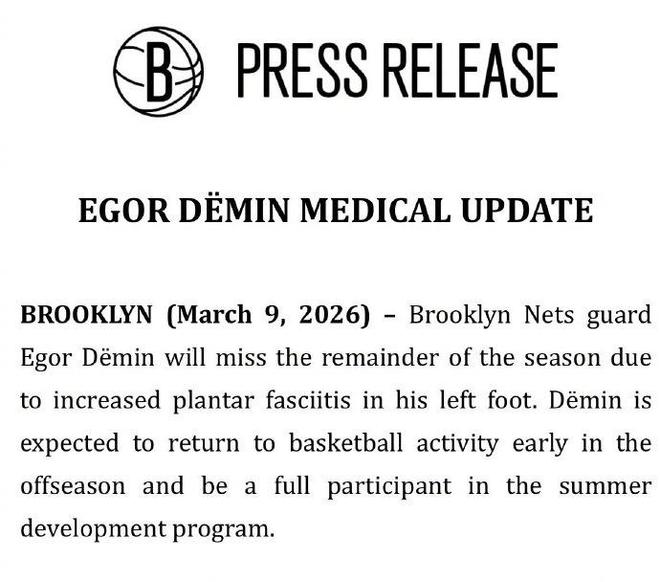 - 篮网官宣:8号秀杰明因伤赛季报销 曾连34场命中三分新秀历史第一