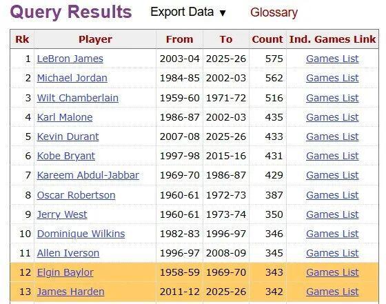 这也是老登常规赛生涯第343场30+,追平埃尔金·贝勒升至历史第12位。
