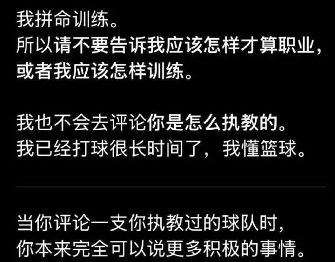 辽宁男篮前主帅杨鸣,日前解说了辽宁男篮和山西男篮的比赛。在这次解说中,杨鸣谈到了辽宁男篮的外援莫兰德,表示莫兰德有时候会在比赛中出现情绪不稳定的情况。对此莫兰德深夜在社交媒体上进行了回应,表达了自己的不满。莫兰德表示,他和杨鸣的关系非常好,但请杨鸣不要告诉自己该怎么做。对于杨鸣说自己情绪不稳定的说法,莫兰德表示杨鸣应该说一些积极的东西,而不是公开说球员的短板。莫兰德还打了个比方,表示自己就不会公开评价杨鸣是怎么执教的。