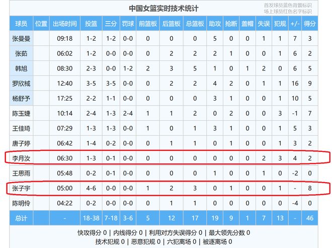 相比张子宇的高光表现,中国女篮主力中锋李月汝的表现,却让人大失所望,首节比赛,她只打了2分钟,就吃到了3次犯规,显然,李月汝没有进入自己的比赛节奏,遇到了大的麻烦。