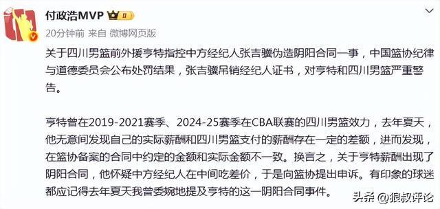 媒体人付政浩发文报道:亨特曾在2019-2021赛季、2024-25赛季在CBA联赛的四川男篮效力,去年夏天,他无意间发现自己的实际薪酬和四川男篮支付的薪酬存在一定的差额,进而发现,在篮协备案的合同中约定的金额和实际金额不一致。换言之,关于亨特薪酬出现了阴阳合同,他怀疑中方经纪人在中间吃差价,于是向篮协提出申诉。有印象的球迷都应记得去年夏天我曾委婉地提及亨特的这一阴阳合同事件。