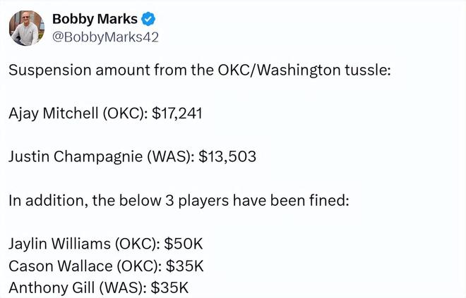 北京时间3月23日,NBA官方发布公告宣布,由于在周日两队的冲突事件中涉事,奇才队前锋贾斯汀-尚帕涅和雷霆队后卫阿贾伊-米切尔各被禁赛一场。联盟声明称,尚帕涅和米切尔因在场上发生冲突、激化斗殴行为,且冲突蔓延至观众席,被处以无薪禁赛。除两人遭禁赛外,雷霆内线球员杰林-威廉姆斯被罚款5万美元,雷霆后卫卡森-华莱士和奇才前锋安东尼-吉尔各被罚款3.5万美元。