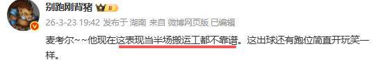 别跑刚背猪究竟批的是谁呢?没错,他批的是打首发的小外援麦考尔。昨晚在三个小外援中,表现最差的是麦考尔,他根本打不了控卫,很难串联球队,很难组织起有效的战术,多余动作太多太难看,突破又突不起,毫无杀伤力,全场只有两次罚球,可以说杀伤力为0。没突破,没三分,没组织,货真价实的三无小外援,要这样的外援有何用?也难怪媒体人怒批麦考尔这表现当半场搬运工都不靠谱。其实这位关心广东队的媒体人,早在第一阶段就建议裁掉正在养伤的麦考尔。现在看来杜锋让他留下,就是一个大错误。
