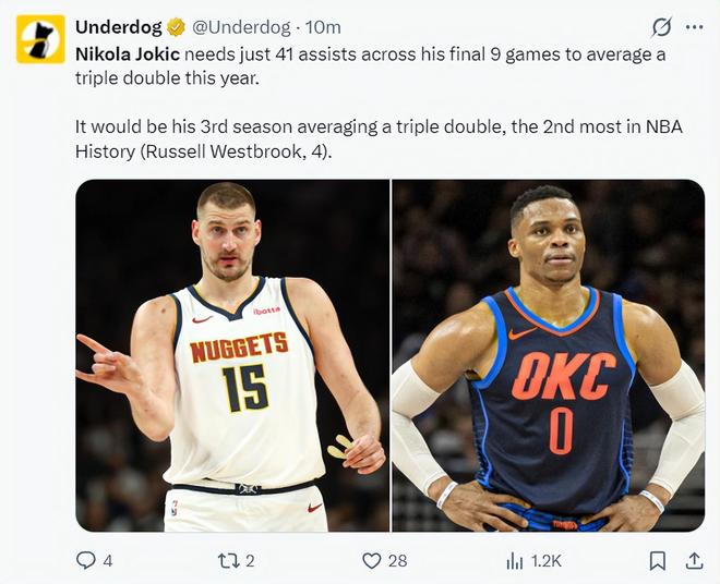 - 仅差51次!仅差16个!约基奇迎来神级里程碑,威少的纪录保不住了