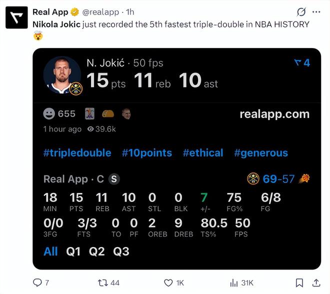 这场比赛约基奇又完成多项纪录:1.约基奇18分钟完成三双历史第五快;