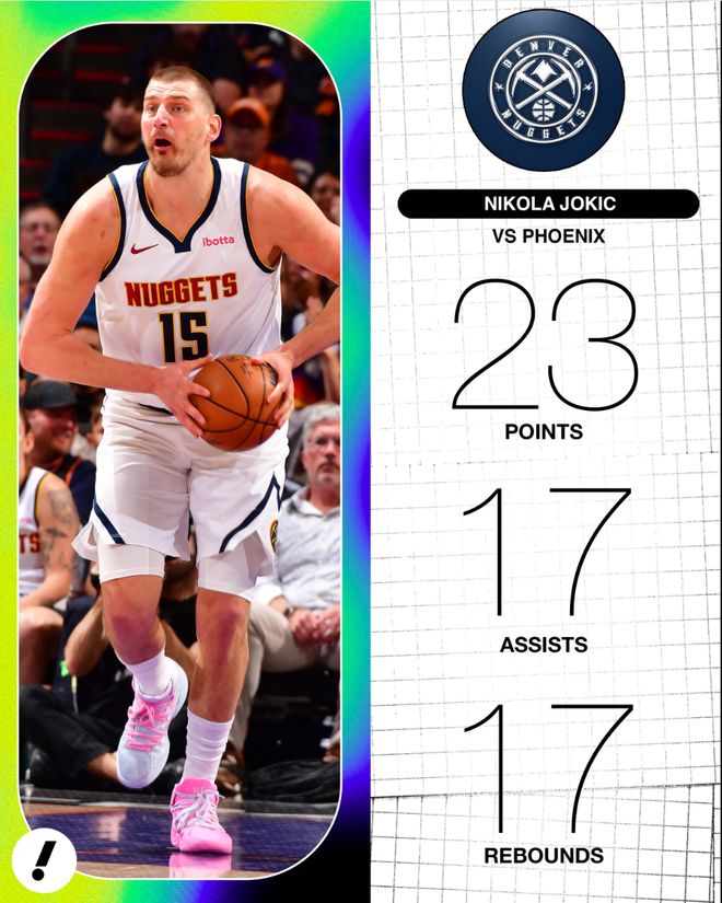 此役后约基奇场均34.8分钟,拿到28分12.6篮板10.6助攻1.5抢断0.8盖帽,命中率57.3%,三分命中率38.5%,约基奇是本赛季的篮板王、助攻王、三双王。