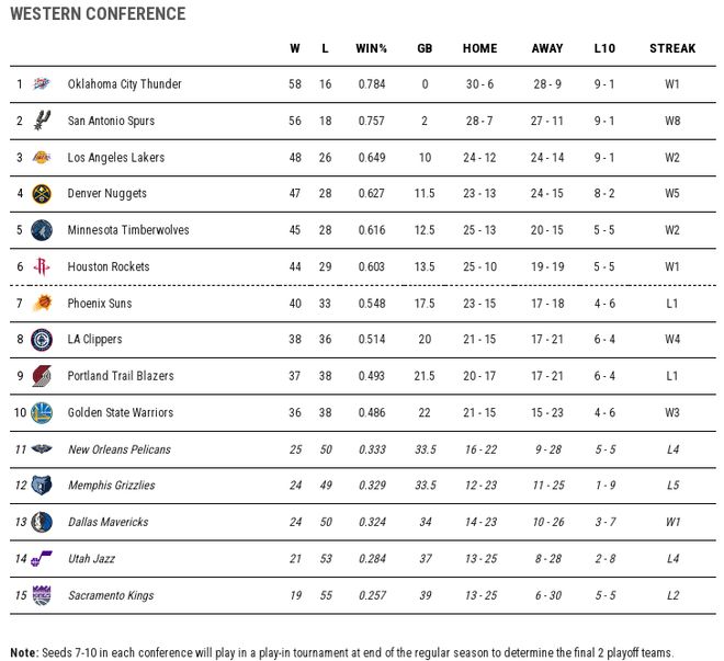西部雷霆与马刺将争夺联盟第一的榜首位置,湖人的西部第三位置还不保险。西部前六球队基本确定,而附加赛后三名的排名还存在不小的悬念。