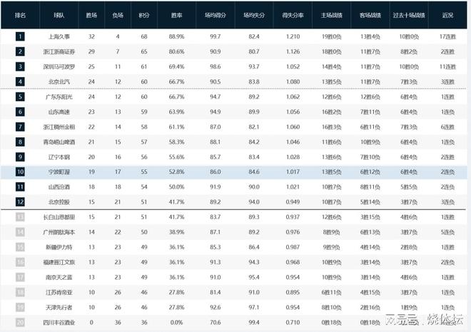 - 上海17连胜锁定第一,黑马巩固第3,4队争第4,广东占优,辽宁第9