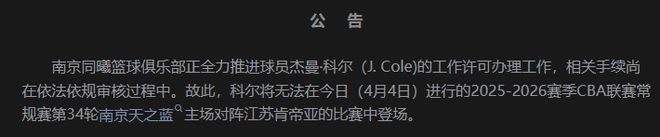 至于原因,南京同曦球队也在官方公告中解释是J.Cole工作许可证还没下来,相关手续尚在审核中。