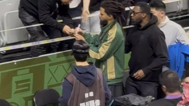虽然没能上场,但在比赛结束后 J.Cole还 跟着球队绕场一周,主动和现场的歌迷击掌互动,并且会停下来为他们签名或者合影。