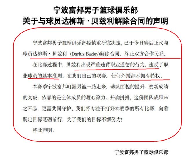 宁波队方面表示,外援贝兹利,出现严重违背职业道德的行为,因此,正式解除双方的合同。与此同时,宁波队还表示CBA联赛是我们自己的联赛,任何一个外援,都是不拥有特权!