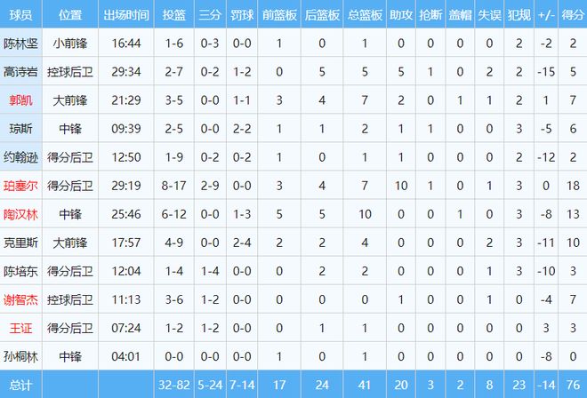 本场比赛,伤愈复出的克里斯状态平平,得到10分2篮板。珀塞尔拿下全队最高的18分7篮板10助攻,是全队发挥最出色的外援。陶汉林依旧强硬,在麦基和周琦面前得到13分10篮板。其他球员无人得分上双,约翰逊如同梦游,9投仅1中,得到2分。琼斯上场9分半,得到6分2篮板。