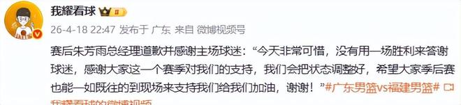 广东队牛皮哄哄,昨天举行了球迷答谢日,球馆坐满了球迷,却用输球的形式答谢主场球迷,真是太丢人了。也许广东队管理层感到心虚,比赛一结束,总经理朱芳雨现场面对球迷作了道歉。他说,“今天非常可惜,没有用一场胜利来答谢球迷,感谢大家这一个赛季对我们的支持,我们会把状态调整好,希望大家季后赛也能一如既往的到现场来支持我们给我们加油,谢谢!”然而广东球迷并不接受朱芳雨的道歉,他们表示朱芳雨的话可以翻译为:我们特意输了为了多赚两场附加赛的钱,一定要买票来看啊。有球迷调侃:计划有变,要打附加赛,你们又可以来多两次主场了。哈哈喊朱芳雨和杜锋下课的声音也不少。昨晚尴尬了,遭对手内涵,自己还要道歉,广东队活得真不自在。你们说呢?