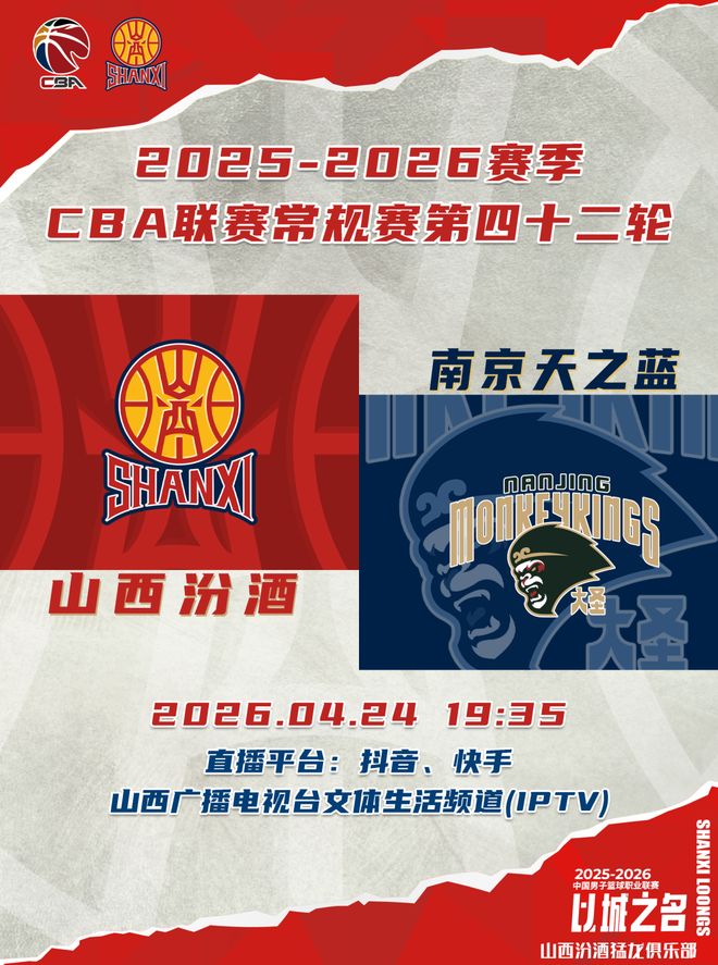 北京时间2026年4月24日19:35,2025-2026赛季CBA联赛常规赛第42轮继续进行,山西汾酒主场对阵南京天之蓝,迎来常规赛收官之战,球迷观众可以通过抖音、快手、山西广播电视台文体生活频道(IPTV)观看比赛实况,让我们与球队一起战斗到底!