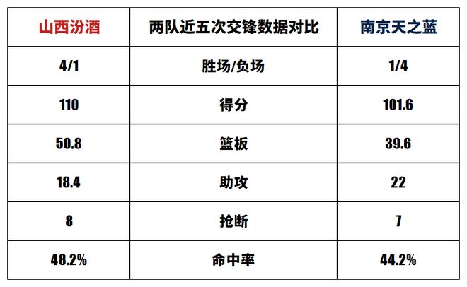 山西汾酒与南京天之蓝历史上一共交手29次,山西汾酒20胜9负。本赛季两队交手1次,山西汾酒1胜0负。