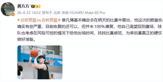 更受关注的是锋线核心曾凡博的复出计划。据BTV记者勇方方确认,这位23岁国手将在时隔80天后,于4月24日对阵吉林的比赛中重返赛场。自2月3日对阵福建后,曾凡博因膝伤缺席30场比赛,本赛季仅出战11场,场均11.5分、3.5篮板、1.4助攻,攻防两端的全面性令人期待。尽管恢复尚未达100%,但球队评估风险可控,决定给予其有限出场时间,旨在“找回比赛节奏”,为季后赛硬仗蓄力。
