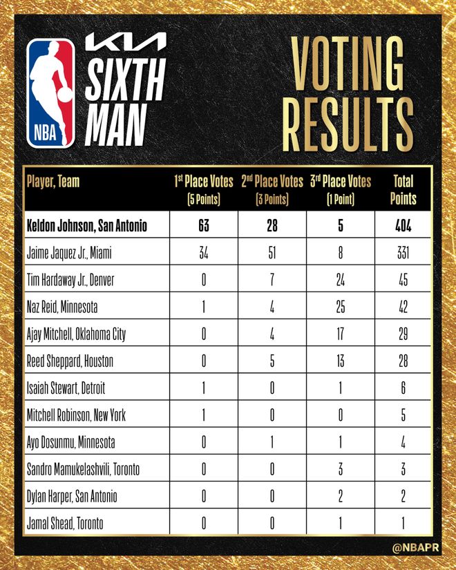 北京时间4月23日,NBA官方宣布,马刺球员凯尔登-约翰逊当选年度最佳第六人,他击败了热火的小海梅-哈克斯以及掘金的小蒂姆-哈达威,拿到这一奖项。马刺目前已经斩获两大奖项,之前,文班亚马全票当选年度最佳防守球员。