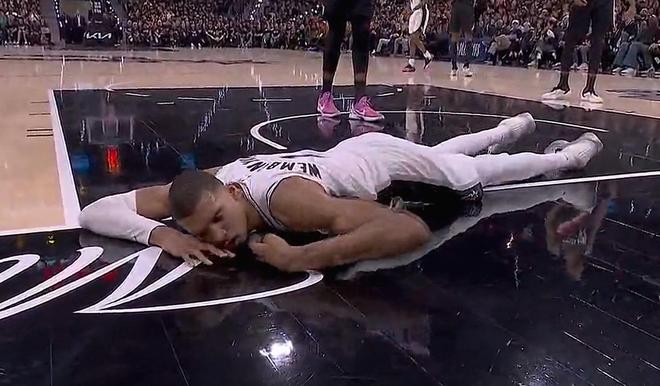 本场比赛第二节,文班亚马在突破时失去重心摔倒在地,随后退出比赛。