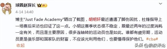 若是没有太好的身体状态,前往国家队集训也没有太大的意义,希望接下来一周时间,胡明轩可以好好恢复,争取全新的状态出现在季后赛。