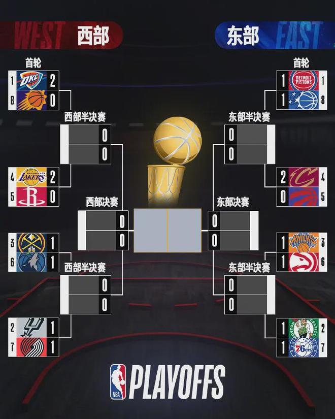 西部雷霆2-太阳、湖人2-0火箭、掘金1-1森林狼、马刺1-1开拓者;