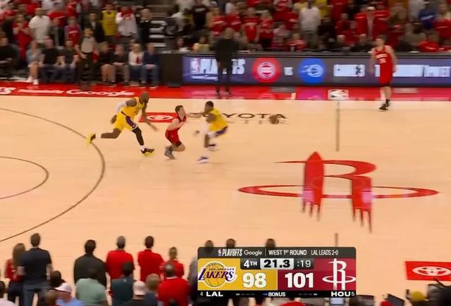最后25.4秒,火箭后场发球给谢泼德,詹姆斯主动上前领防,这是一个41岁打了接近40分钟的詹姆斯,但谢泼德完全没有摆脱詹姆斯的防守,被詹姆斯身后掏球直接抢断。