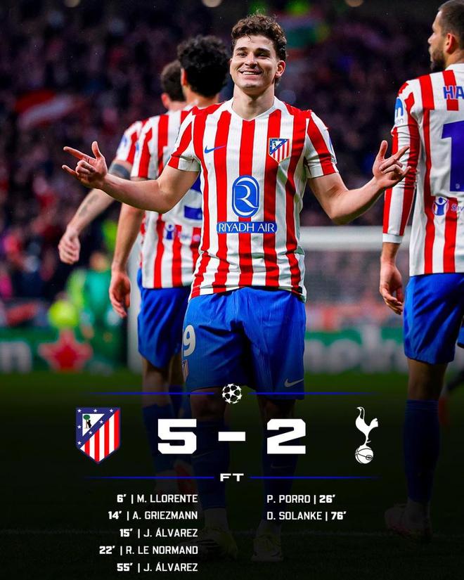 - 马竞5-2热刺 阿尔瓦雷斯双响