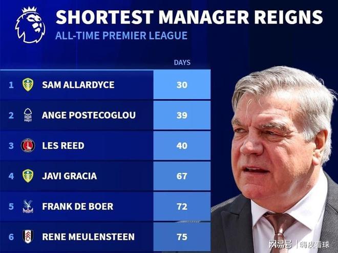 统计表明,英超执教时间最短的是阿勒代斯,带领利兹联只有短短30天的时间,有趣的是,阿勒代斯在英格兰只有一场的执教经历,胜率高达100%,“短命”并不是没有原因的。第二短的主教练,大家都很熟悉,就是上赛季带领热刺夺冠的波斯特科格鲁,本赛季执教诺丁汉森林只有39天,8场比赛无一取胜,下课并不意外。