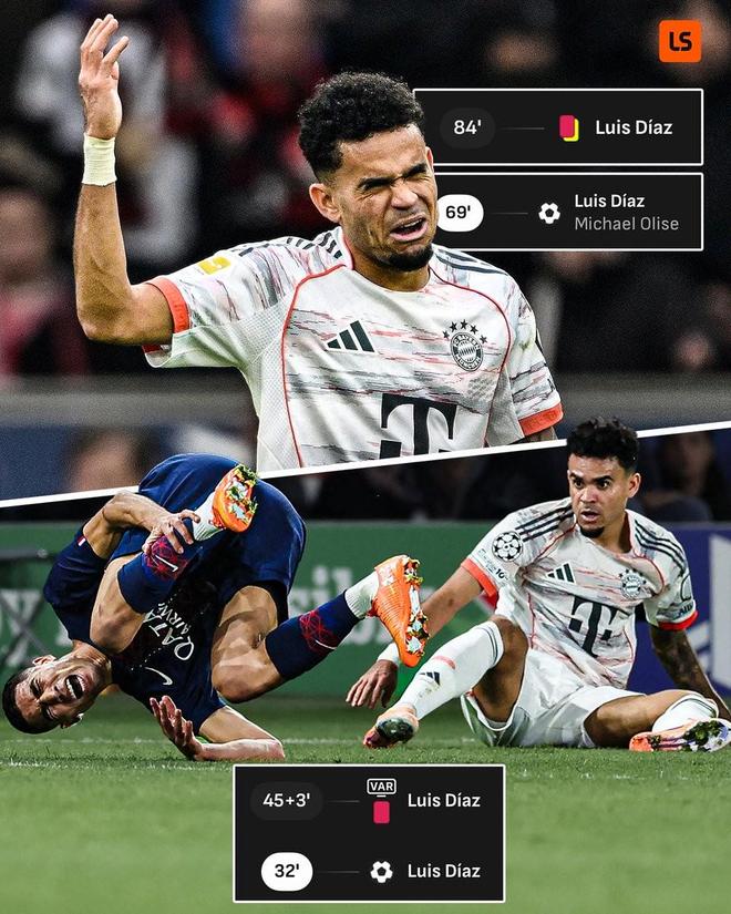 此役客场对阵勒沃库森,首发出战的路易斯-迪亚斯在比赛第69分钟破门为拜仁扳平比分,随后因被判假摔而领到第二张黄牌,两黄变一红被罚下。