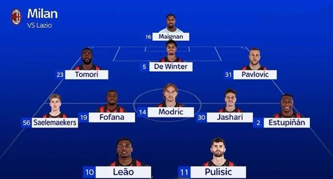米兰352:迈尼昂;托莫里、德温特、帕夫洛维奇;萨勒马科尔斯、福法纳、莫德里奇、亚沙里、埃斯图皮尼安;莱奥、普利西奇