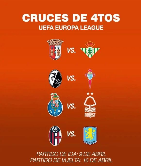 - 欧联8强出炉:英超西甲各2队 贝蒂斯战布拉加!维拉PK博洛尼亚