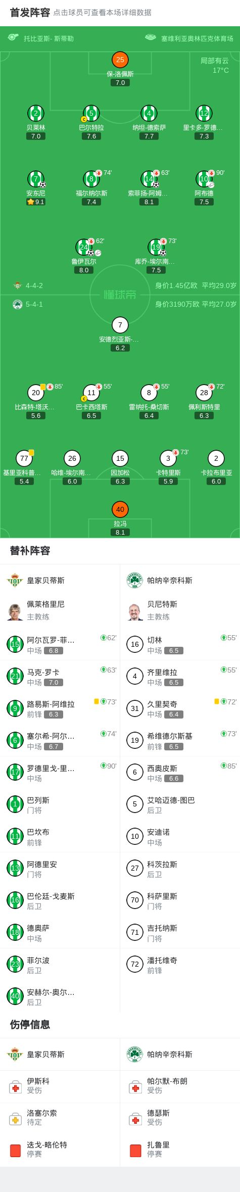 - 半场:贝蒂斯2-0帕纳辛奈科斯,阿姆拉巴特世界波、鲁伊瓦尔破门
