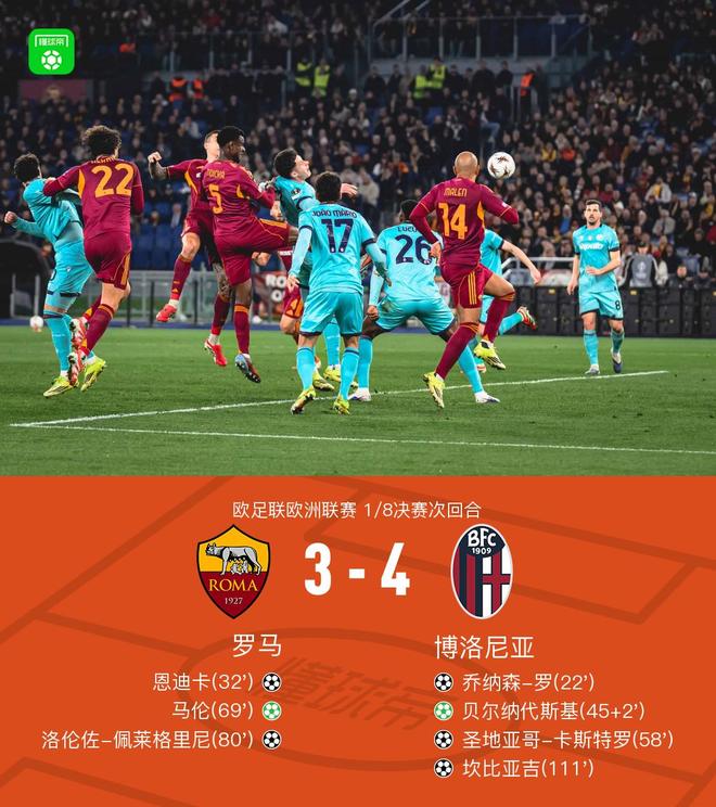 北京时间3月20日欧足联欧洲联赛 1/8决赛次回合,罗马对阵博洛尼亚。上半场罗首开记录,随后恩迪卡破门扳平,贝尔纳代斯基点射破门领先,下半场卡斯特罗破门扩大比分,马伦点射破门佩莱格里尼破门扳平比分。加时赛坎比亚吉破门制胜。最终比分罗马 3-4 博洛尼亚。两回合总比分罗马4-5博洛尼亚。
