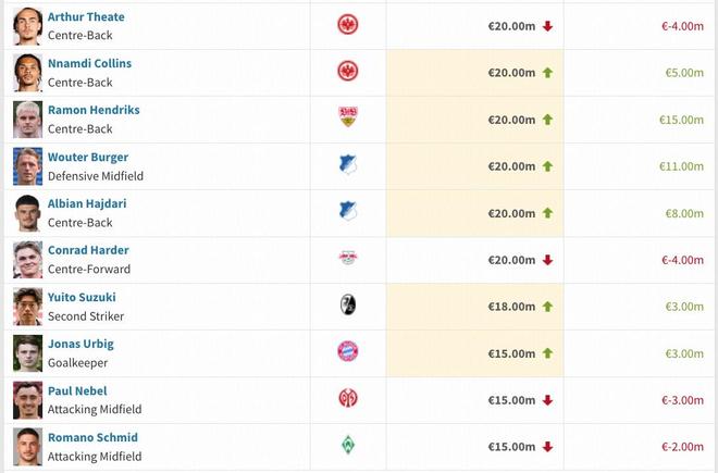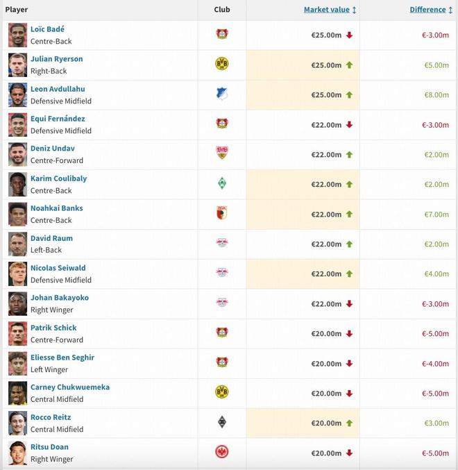 本期德甲有12名球员身价上涨超1000万欧,其中扬-迪奥曼德上涨3000万欧最多,武什科维奇2000万欧,勒沃库森队科法内上涨1800万欧,马扎上涨1500万欧,斯图加特队莱韦林与亨德里克斯均上涨1500万欧。