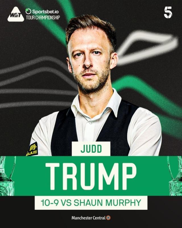 2026世界斯诺克巡回锦标赛1/4决赛,全场比赛贾德·特鲁姆普打出两杆破百(140、137)和五杆50+(58、62、86、90、59),肖恩·墨菲打出两杆破百(132、127)和七杆50+(72、59、51、71、69、52、96)。第一阶段过后双方战成4比4平,第二阶段上半场特鲁姆普先胜一局,墨菲连胜三局7比5领先进入中场休息,下半场双方交替领先,战至9比9平,决胜局墨菲率先上手,特鲁姆普抓住机会逆转获胜。最终特鲁姆普10比9战胜墨菲晋级四强,半决赛中,他将对阵尼尔・罗伯逊与巴里・霍金斯之间的胜者!
