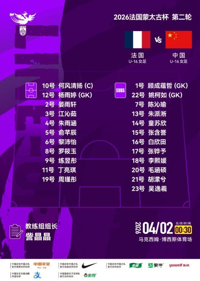 北京时间4月2日00:30,蒙太古女杯小组赛A组第2轮,中国女足U16在法国马克西姆·博西斯体育场对阵法国女足U16。上半场,周瑾彤凭借任意球直接破门为中国队取得领先;下半场开场,何风清扬禁区内停球转身低射扩大比分,随后法国队依靠点球扳回一城。最终,中国女足U162比1击败法国女足U16。小组赛第三轮,中国女足U16将在北京时间4月4日00:30对阵墨西哥女足U16,法国女足U16则将对阵英格兰女足U16。