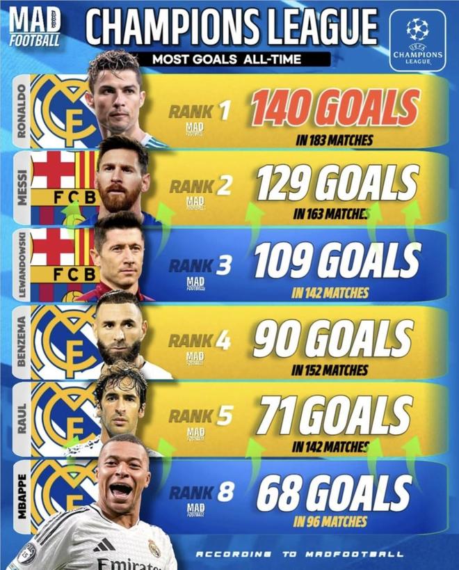 20球是什么概念?按欧足联给出的本赛季欧冠效率,莱万现在是9场4球,场均0.45球;即便按你这张图里的生涯欧冠效率,109球142场,场均也就是0.77球左右。照这个区间去倒推,他大概要再踢26到44场欧冠,才有机会把这20球填平。对一个37岁的中锋来说,这个场次要求非常高。