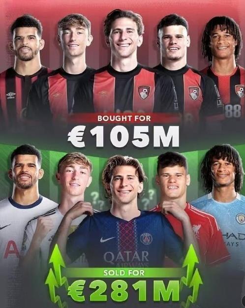 最后,是樱桃军团可持续的运营生态。伯恩茅斯不担心核心流失,当球员打出高光表现并被高价出售后,他们会迅速将资金重新投入到全球“新星市场”中,引进新一代潜力股。这种从引援、培养到高价出售,再投资的良性循环,确保了俱乐部能够持续造血,成就伯恩茅斯在球员交易市场上的长期繁荣。