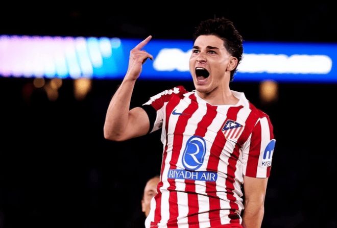 阿尔瓦雷斯站在任意球点前,那脚弧线球绕过人墙,特尔施特根指尖碰到也无法阻止入网。1:0,马竞带着人数优势和领先优势进入更衣室。这是阿尔瓦雷斯本赛季欧冠第9球,超越迭戈·科斯塔保持12年的马竞单赛季进球纪录。