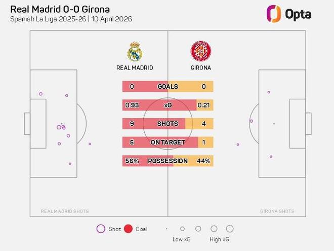 此役主场对阵赫罗纳,皇家马德里在上半场完成9次射门,其中5次射正,但未能转化为进球。