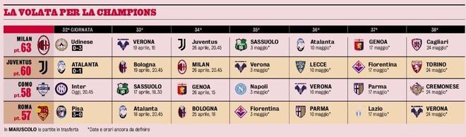 最后6轮比赛,这4支球队的赛程都不够乐观,最终的排名存在很大变数。米兰方面,先是客场挑战降级区的维罗纳,然后与尤文进行直接对话,之后的对手分别是萨索洛、亚特兰大、热那亚、卡利亚里。