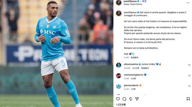 胡安-热苏斯在对阵帕尔马的比赛中出现失误,间接导致球队丢球。赛后,这名那不勒斯后卫通过社交媒体向球迷致歉。