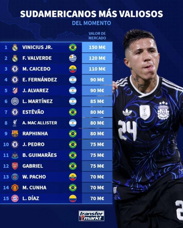德国转会市场列出了南美球员身价排名,维尼修斯1.5亿欧居首,巴尔韦德1.2亿欧次席。南美球员德转身价榜: