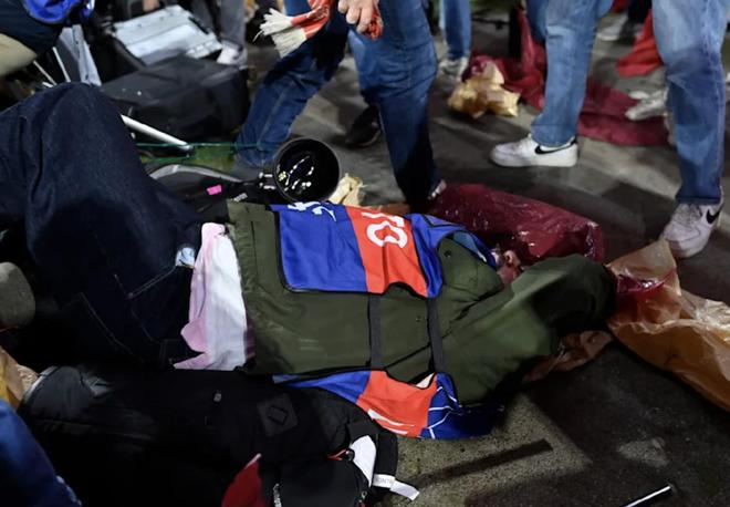 据现场描述,当医护人员发现他时,他正倒在地上,背景中还能看到红色的助威横幅,现场并没有明显出血的迹象。