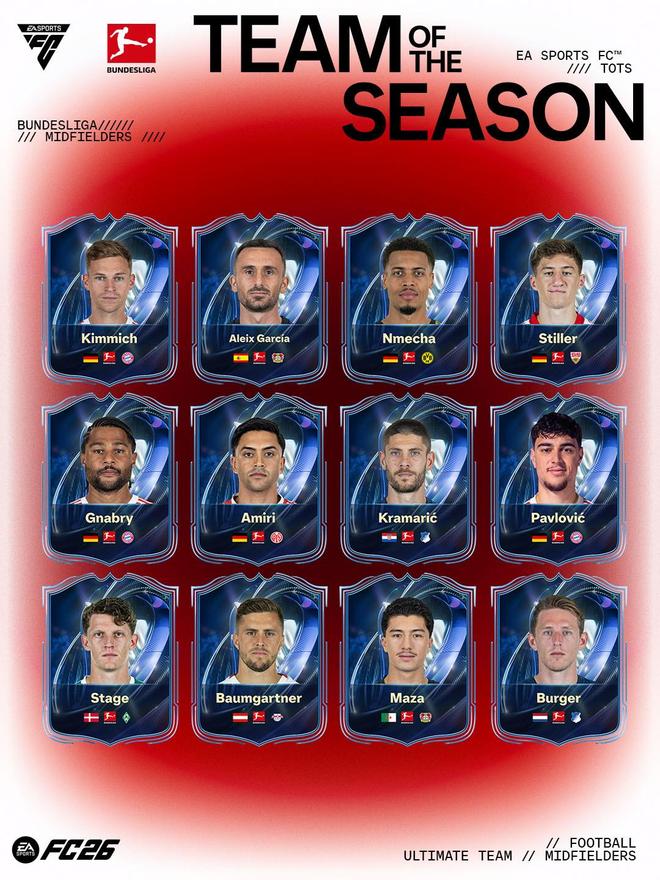 - FC26德甲赛季最佳阵容提名:凯恩、奥利塞领衔,拜仁9人入选