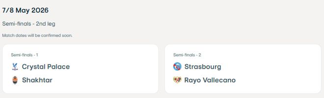 顿涅茨克矿工以总比分5-2击败阿尔克马尔;水晶宫以4-2的总比分战胜佛罗伦萨,这两支球队将争夺一个决赛名额。