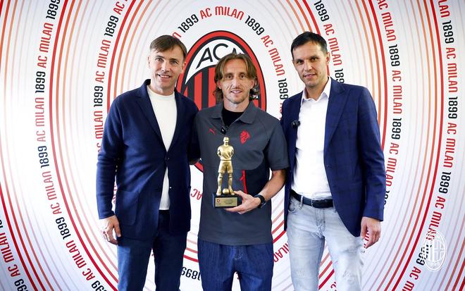 在AC米兰俱乐部,前克罗地亚国脚、米兰旧将达里奥-西米奇(图中左一)向莫德里奇颁发了奖杯。