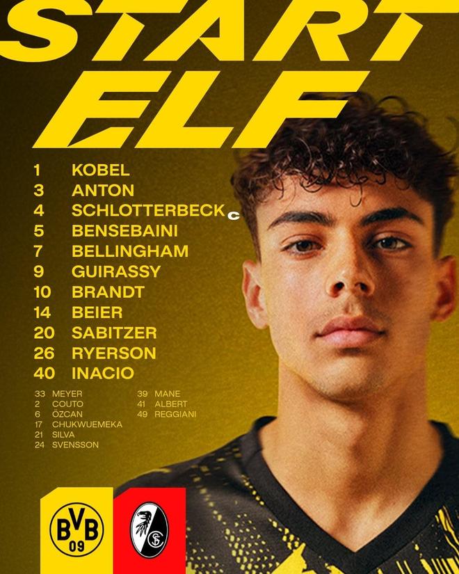 多特首发:1-科贝尔、26-瑞尔森、4-施洛特贝克、5-本塞拜尼、3-安东、7-乔布-贝林厄姆、10-布兰特、20-萨比策、40-伊纳西奥、14-拜尔、9-吉拉西