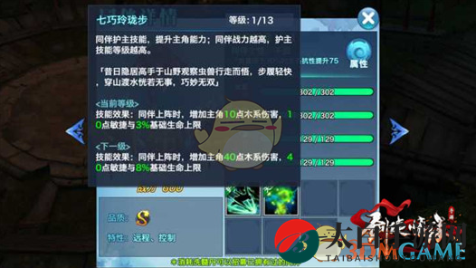 护主技能:七巧玲珑步。同伴上场时,提升主角木系伤害、敏捷及基础生命上限。